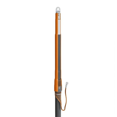 Для кабелей с проволочным экраном заземляющий провод формируется непосредственно из медных проволок экрана (6). Герметизация узла заземления достигается применением ленты-герметика (7). Для сглаживания напряженности электрического поля на участке полупроводящего слоя изоляции кабеля накладывается пластина выравнивания электрического поля (4), поверх пластины усаживается трубка-манжета (3). На жилу кабеля устанавливают наконечник с контактными срывными болтами или другим способом (опрессовкой, пайкой) по желанию заказчика (1). Для усиления фазной изоляции и эффективной защиты от воздействий окружающей среды и токов утечки на жилу кабеля усаживается трекингостойкая трубка с клеевым подслоем (цвет трубки - кирпично-красный)(2). Нижний конец трекингостойкой трубки перекрывает узел заземления, верхний — заходит на цилиндрическую часть наконечника, обеспечивая полную герметичность конструкции.